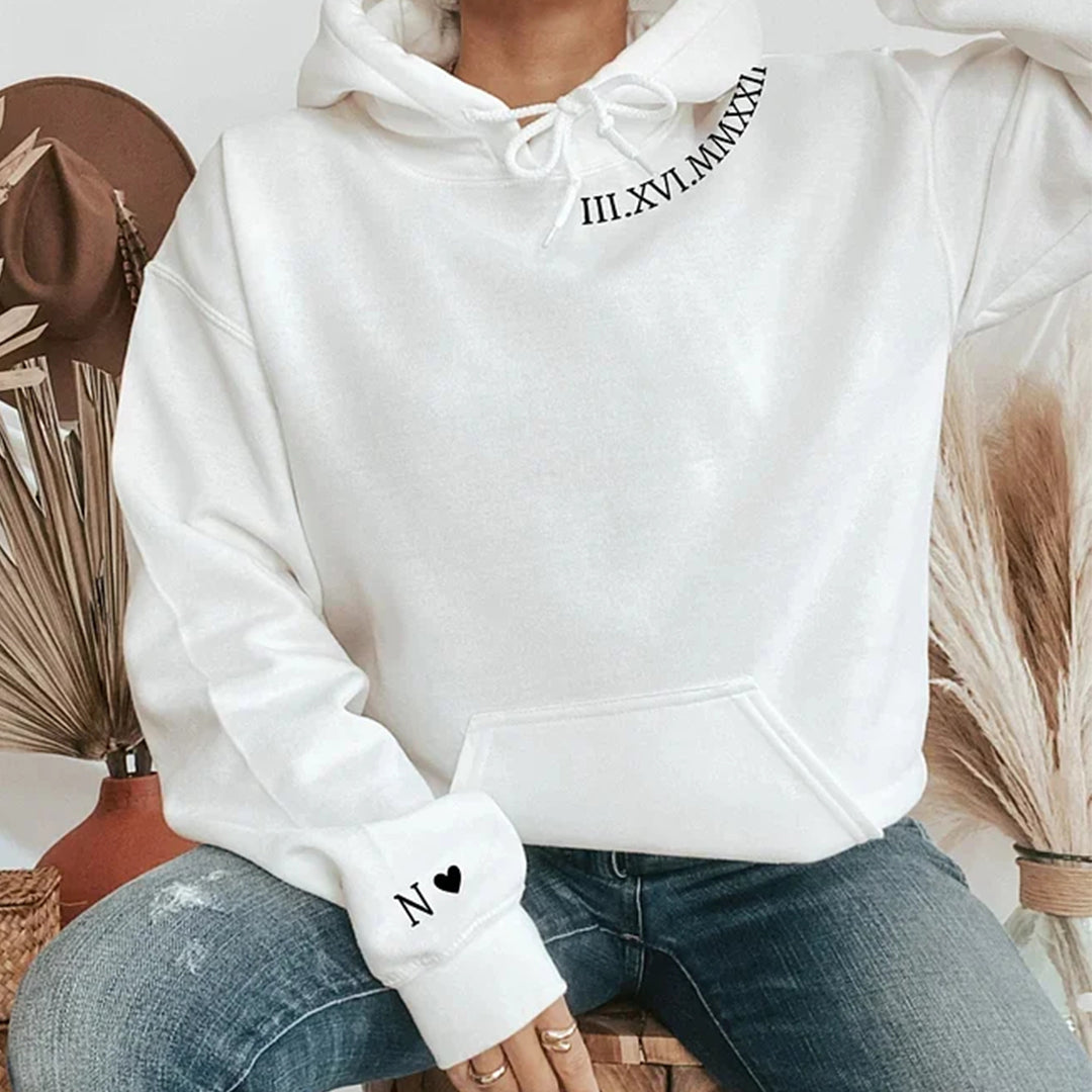 Custom Roman Numerals Date Embroidery Sweatshirt Hoodie with Intimate Phrases on Sleeves HCVD11B