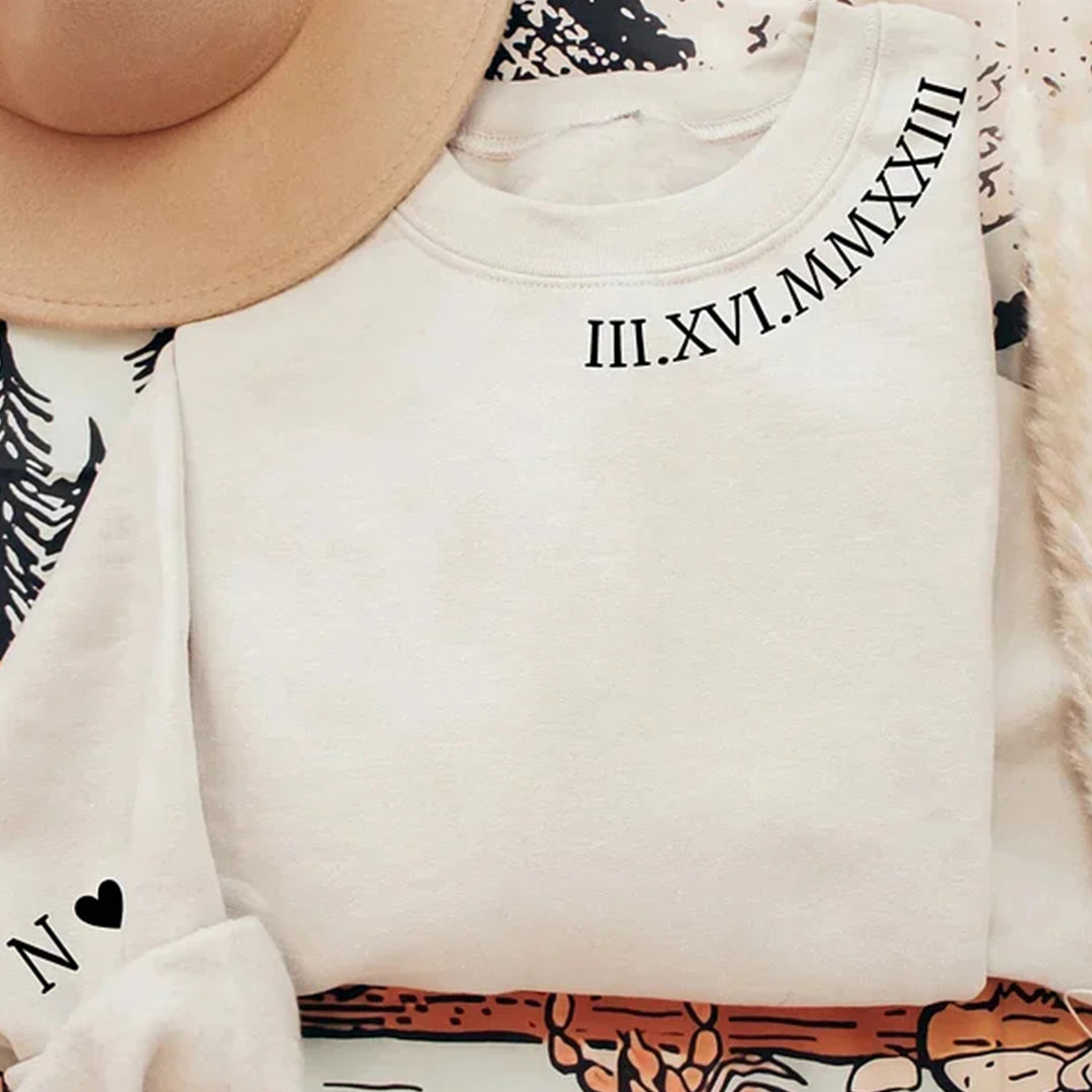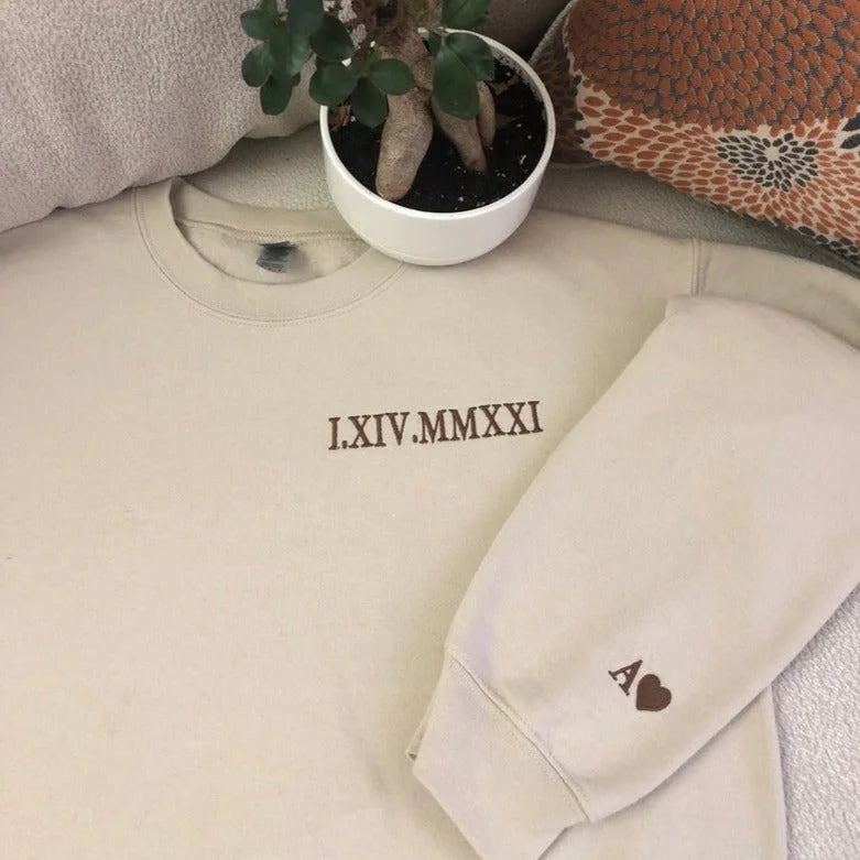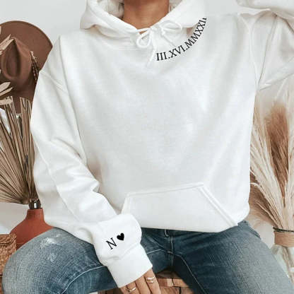 Custom Roman Numerals Date Embroidery Sweatshirt Hoodie with Intimate Phrases on Sleeves HCVD02C